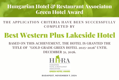Ezen törekvések hivatalos elismeréseként a Best Western Plus Lakeside Hotel 2024-ben "Aranyfokozatú Zöld Szálloda" rangot kapott.
